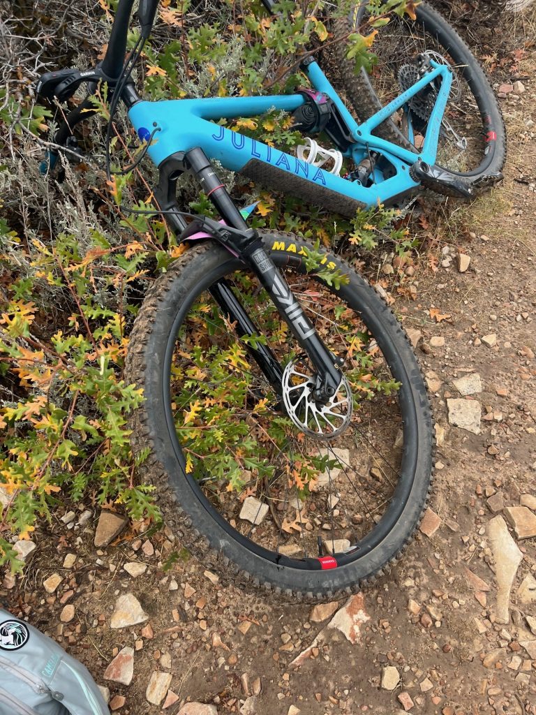 Athena – Goddess of War – 2024 Juliana Roubion C AXS: Size Medium – Fits rider heights 5’5” to 5’9”. Same geometry as a Santa Cruz Bronson, 160mm front travel, 150mm of rear travel, 29er front and 27.5″ rear wheel. The all around bike that descend with fun and pop and still climbs.
